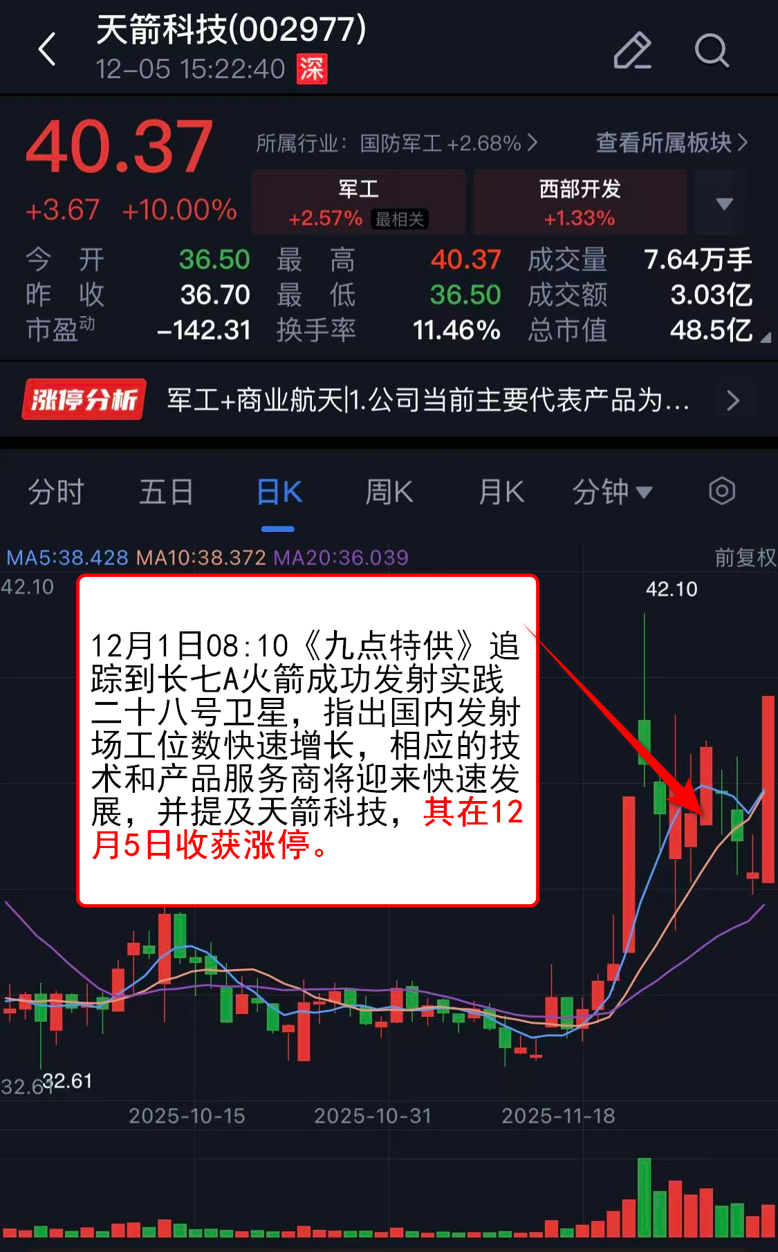 12月1日08:10《九点特供》追踪到长七A火箭成功发射实践二十八号卫星,指出国内发射场工位数快速增长,相应的技术和产品服务商将迎来快速发展,并提及天箭科技,其在12月5日收获涨停。