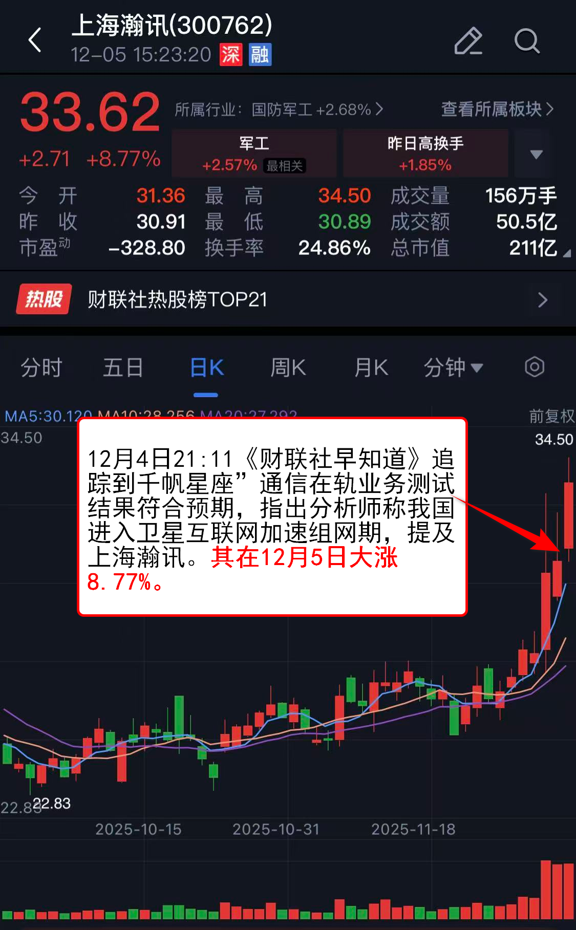 12月4日21:11《财联社早知道》追踪到千帆星座”通信在轨业务测试结果符合预期,指出分析师称我国进入卫星互联网加速组网期,提及上海瀚讯。其在12月5日大涨8.77%。