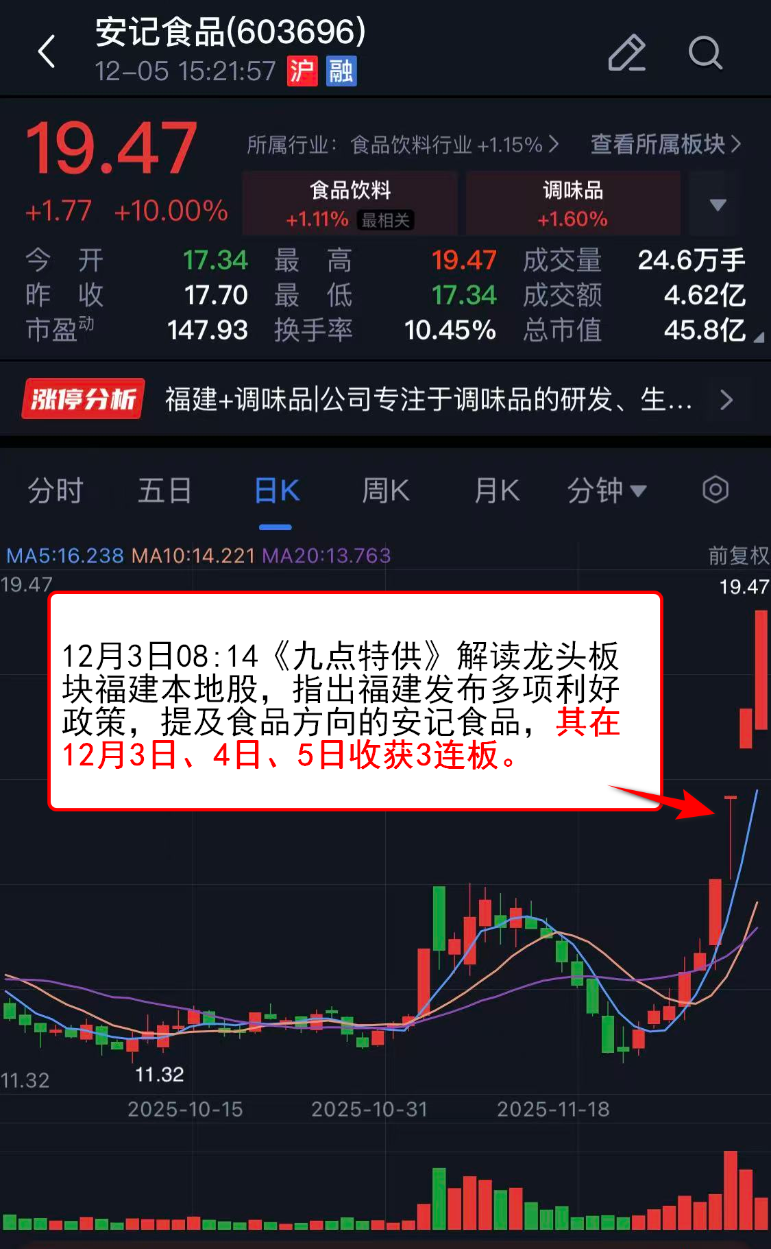 12月3日08:14《九点特供》解读龙头板块福建本地股,指出福建发布多项利好政策,提及食品方向的安记食品,其在12月3日、4日、5日收获3连板。