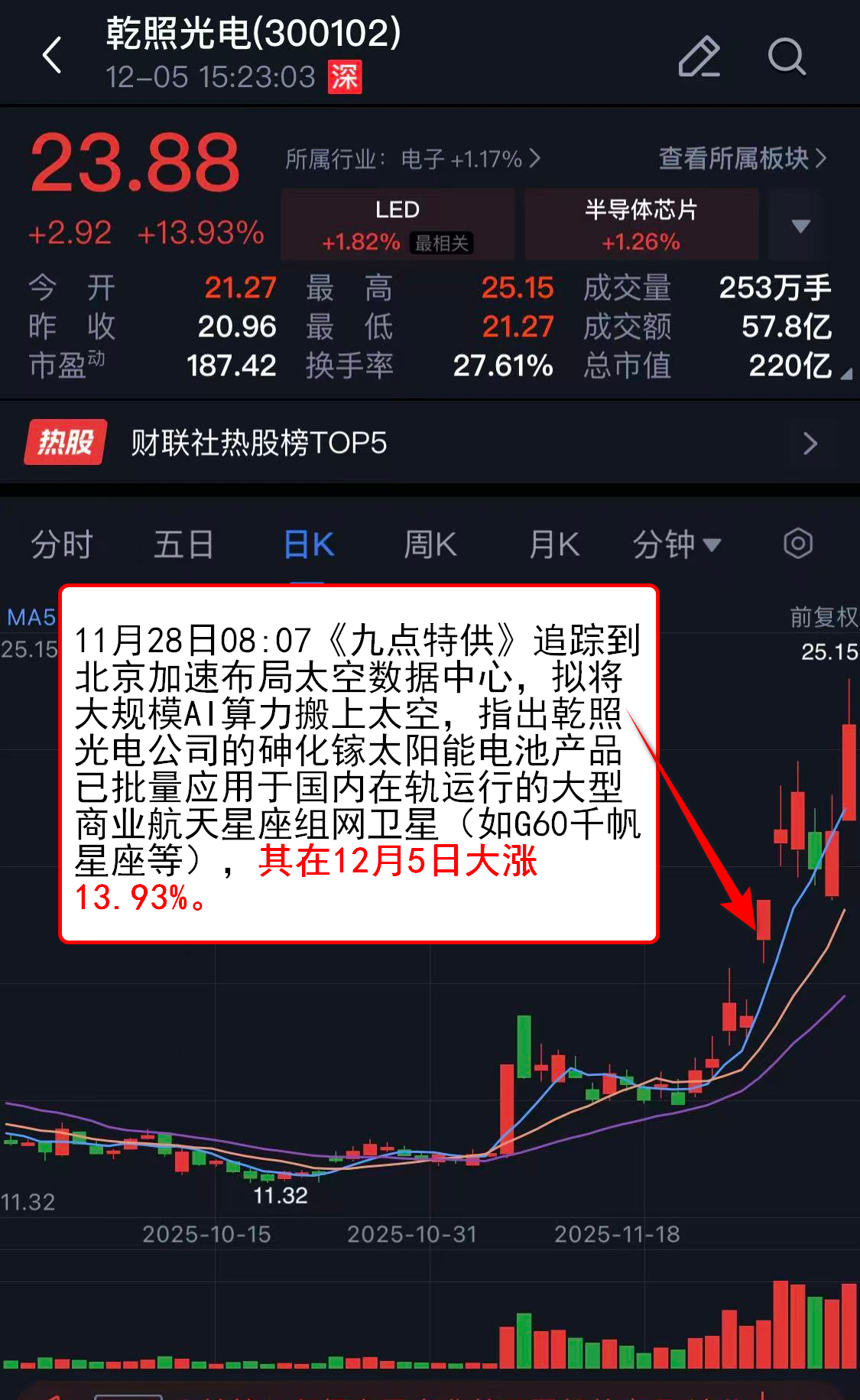 11月28日08:07《九点特供》追踪到北京加速布局太空数据中心,拟将大规模AI算力搬上太空,指出乾照光电公司的砷化镓太阳能电池产品已批量应用于国内在轨运行的大型商业航天星座组网卫星(如G60千帆星座等),其在12月5日大涨13.93%。