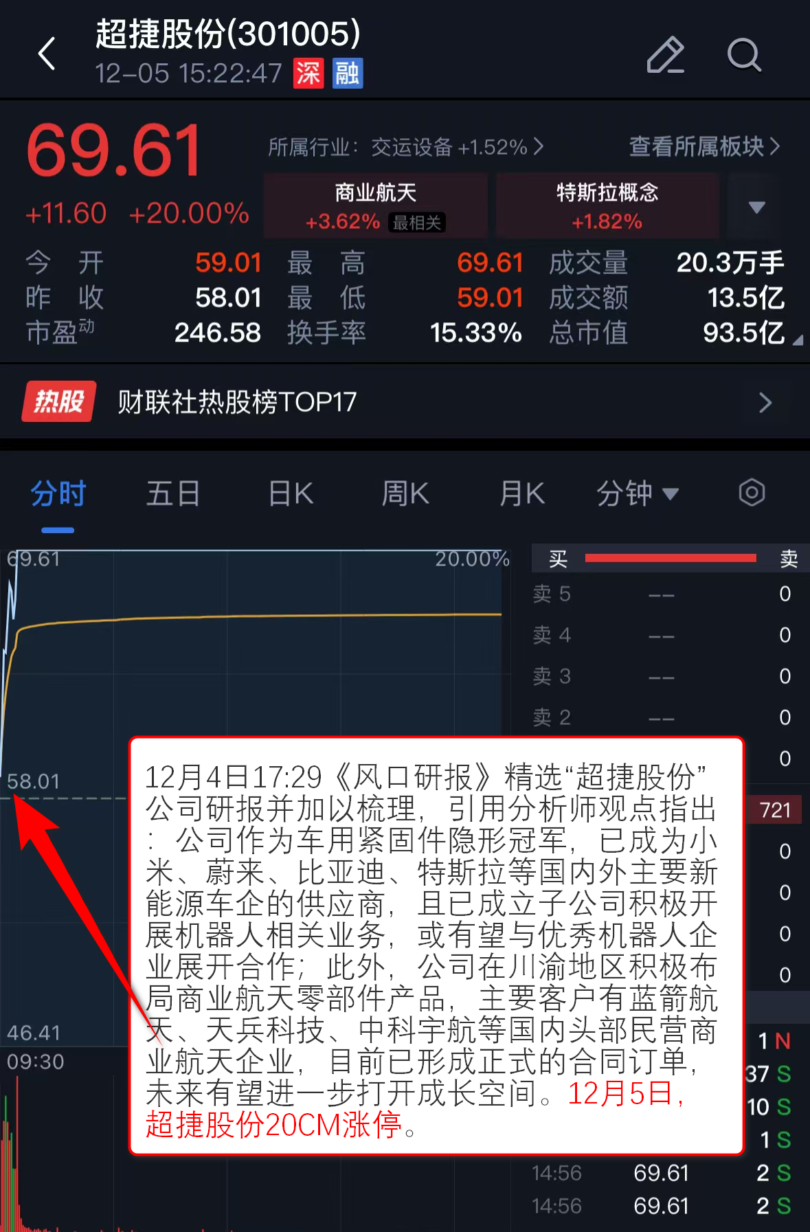 12月4日17:29《风口研报》精选“超捷股份”公司研报并加以梳理,引用分析师观点指出:公司作为车用紧固件隐形冠军,已成为小米、蔚来、比亚迪、特斯拉等国内外主要新能源车企的供应商,且已成立子公司积极开展机器人相关业务,或有望与优秀机器人企业展开合作;此外,公司在川渝地区积极布局商业航天零部件产品,主要客户有蓝箭航天、天兵科技、中科宇航等国内头部民营商业航天企业,目前已形成正式的合同订单,未来有望进一步打开成长空间。12月5日,超捷股份20CM涨停。