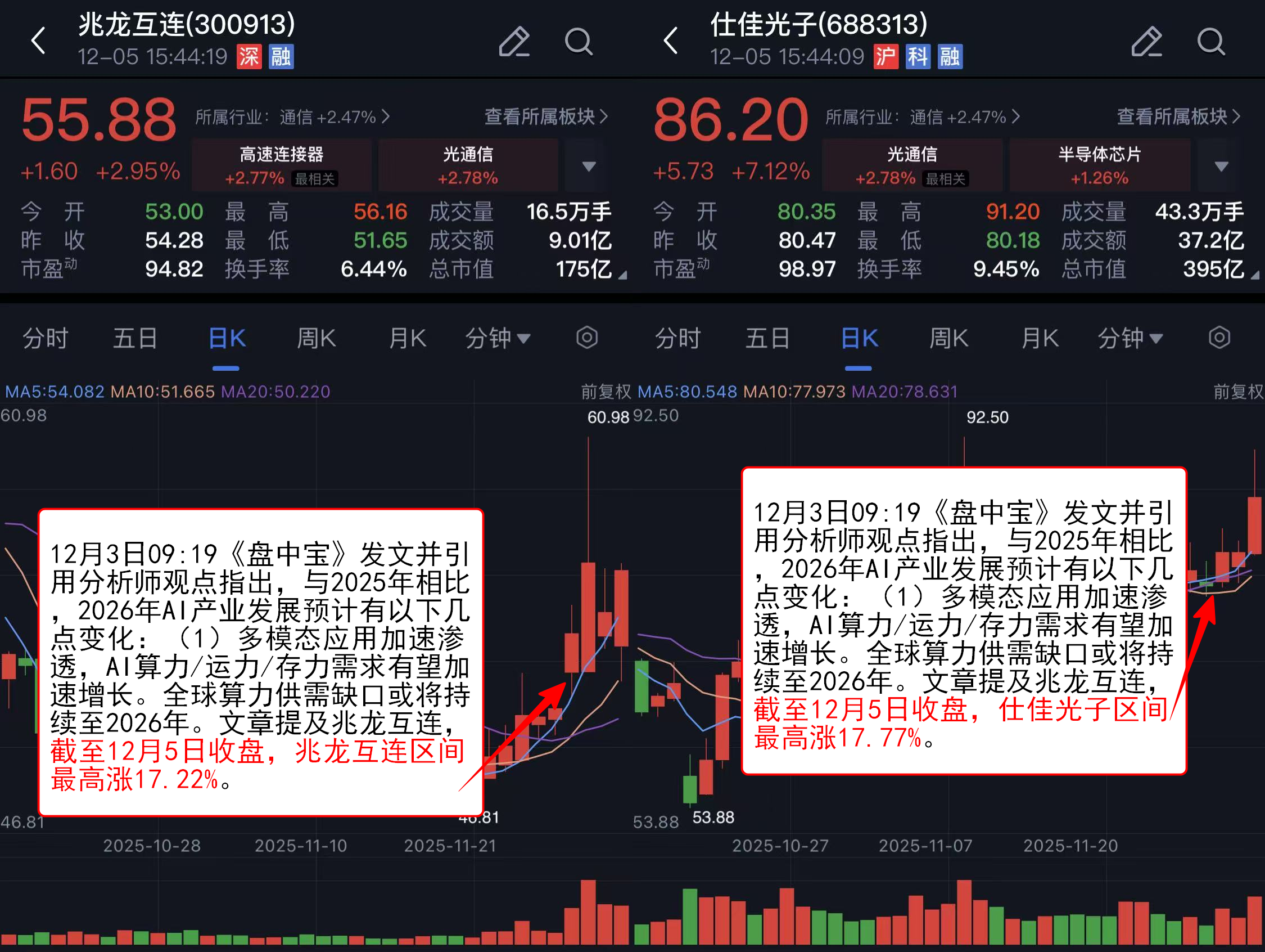 12月3日09:19《盘中宝》发文并引用分析师观点指出,与2025年相比,2026年AI产业发展预计有以下几点变化:(1)多模态应用加速渗透,AI算力/运力/存力需求有望加速增长。全球算力供需缺口或将持续至2026年。文章提及仕佳光子和兆龙互连,截至12月5日收盘,仕佳光子区间最高涨17.77%,兆龙互连区间最高涨17.22%。