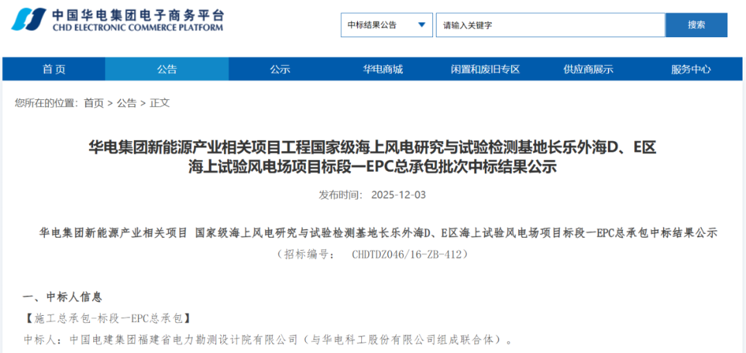 12月3日,中国华电集团电子商务平台发布《华电集团新能源产业相关项目国家级海上风电研究与试验检测基地长乐外海D、E区海上试验风电场项目标段一EPC总承包招标项目中标结果公示》的公告。