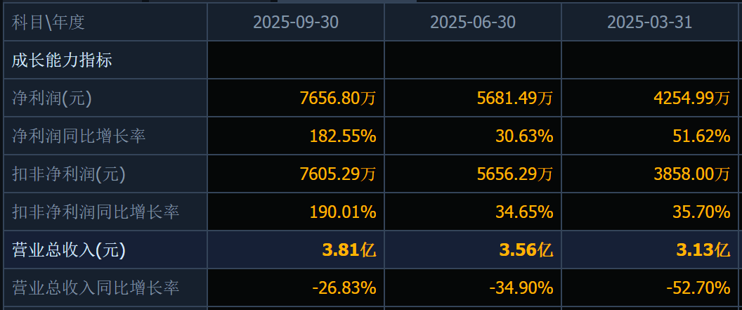 今年第三季度,恒通股份实现营业收入3.81亿元,同比下降26.83%;净利润7,656.8,0万元,同比增长182.55%;扣非净利润7,605.29万元,同比增长190.01%。