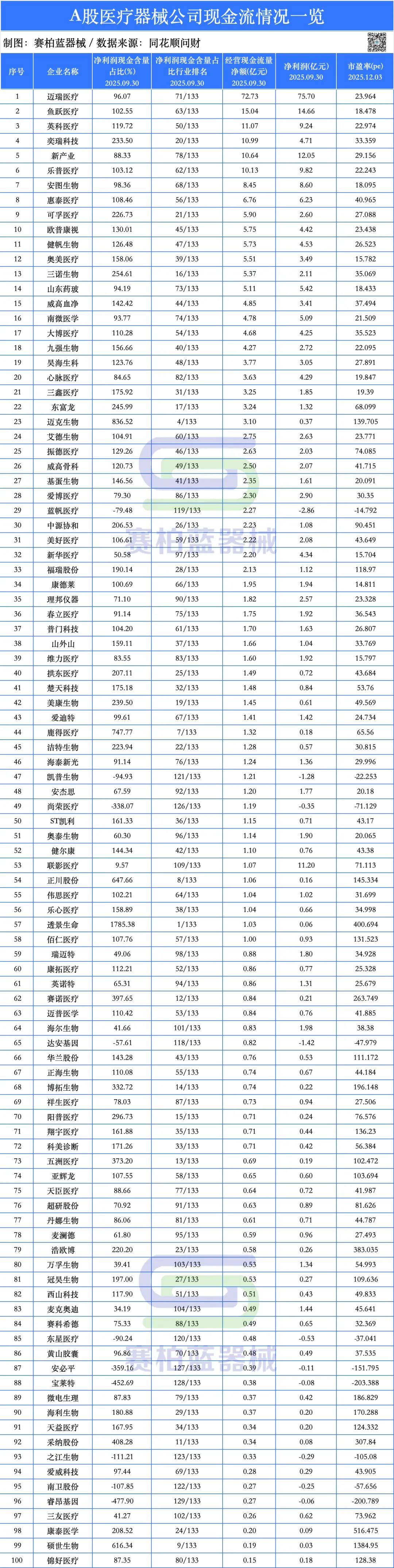 据同花顺问财数据,截至2025年9月30日,A股医疗器械上市企业经营现金流量净额前10的企业分别为迈瑞医疗、鱼跃医疗、英科医疗、奕瑞科技、新产业、乐普医疗、安图生物、惠泰医疗、可孚医疗、欧普康视。前10名中,除了迈瑞、新产业、安图生物,其他企业的经营现金流都高于净利润,其中净利润现金含量占比最高的为奕瑞科技,为233.5%。