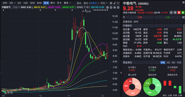 中能电气近期股价表现强势,11月初曾连续2天收获“20cm”涨停板,4天内累计涨近80%。最新股价为9.28元/股,总市值为55.5亿元。