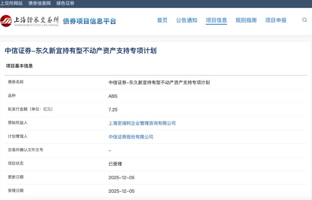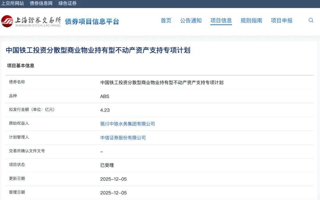 据上交所官网显示,中国铁工投资分散型商业物业持有型不动产资产支持专项计划和中信证券-东久新宜持有型不动产资产支持专项计划已正式申报并获得受理,拟发行金额分别为4.23亿元和7.25亿元。