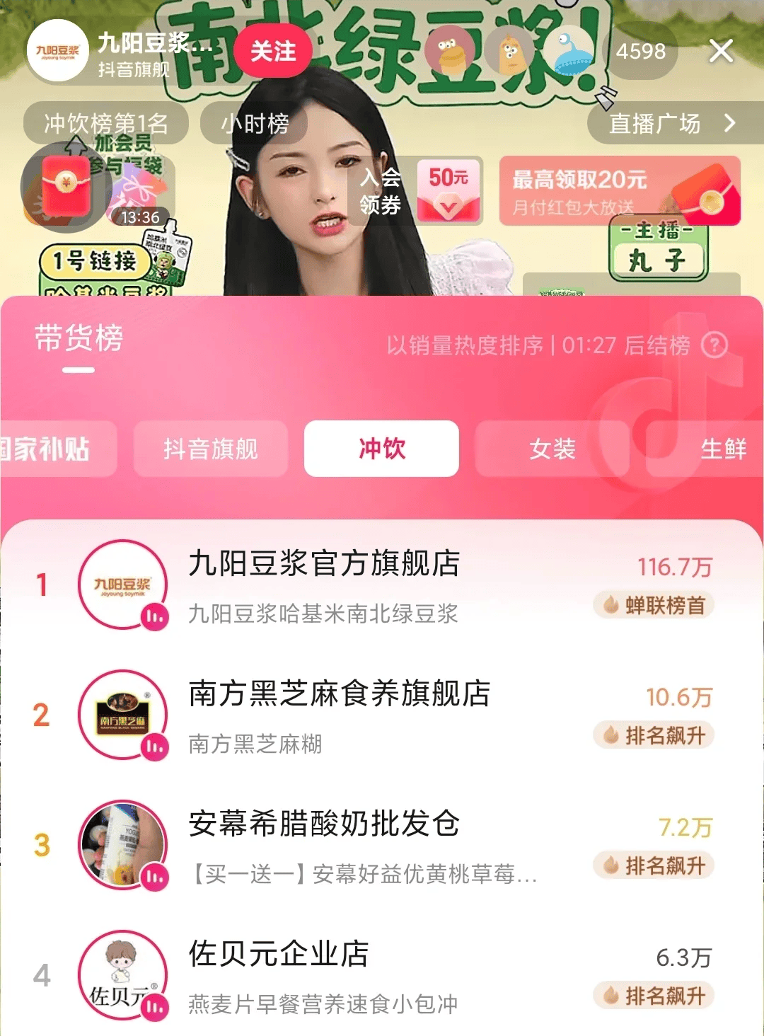 市场给予了狂热的反馈。这款售价29.9元的产品,迅速引爆了年轻人的钱包。抖音旗舰店显示已拼115万袋,单日销量破20万单,蝉联冲饮带货榜榜首,第二、第三名分别是南方黑芝麻和安慕希酸奶,两者的销量只有九阳豆浆的十分之一都不到。据悉,哈基米豆浆还击穿了库存,九阳豆浆原本承诺的现货发售,变成了长达45天的预售。