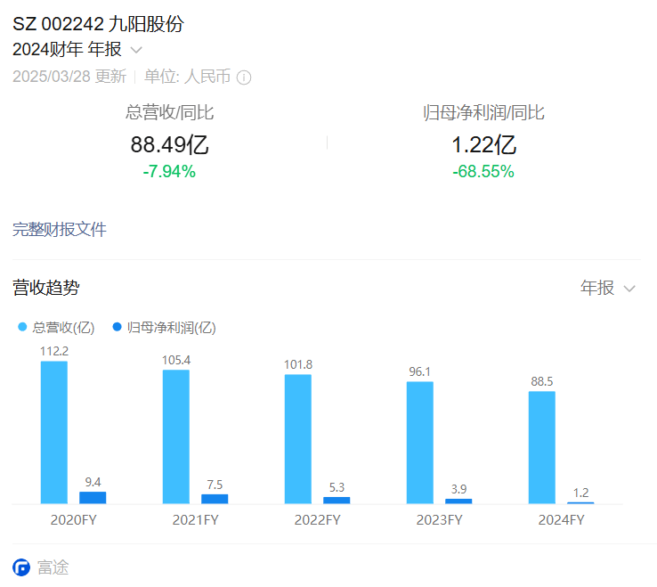 根据九阳豆浆的财报,2024年其营收为88.49亿元,同比下滑8%;净利润为1.22亿元,同比下降68.55%。虽然保持盈利,但在如今的饮品江湖,这个成绩单显得有些尴尬。