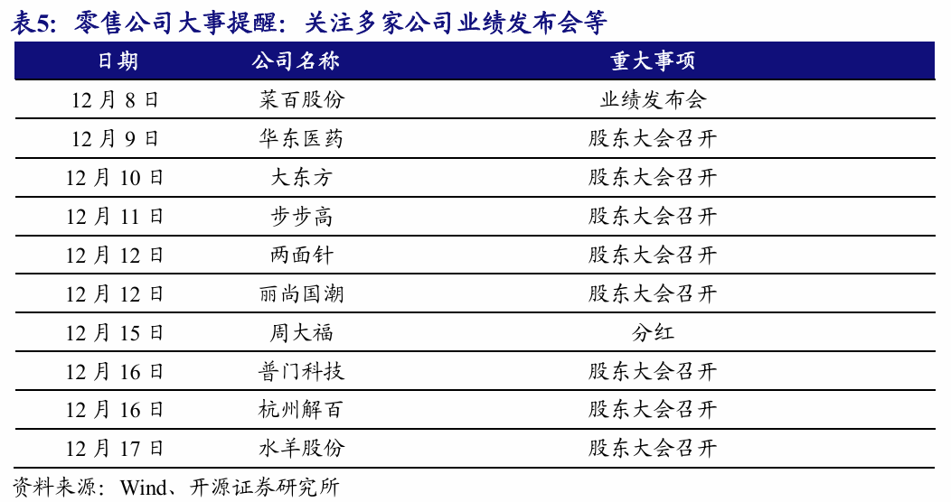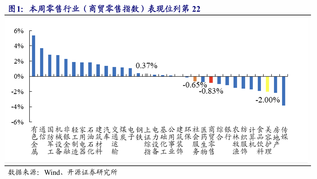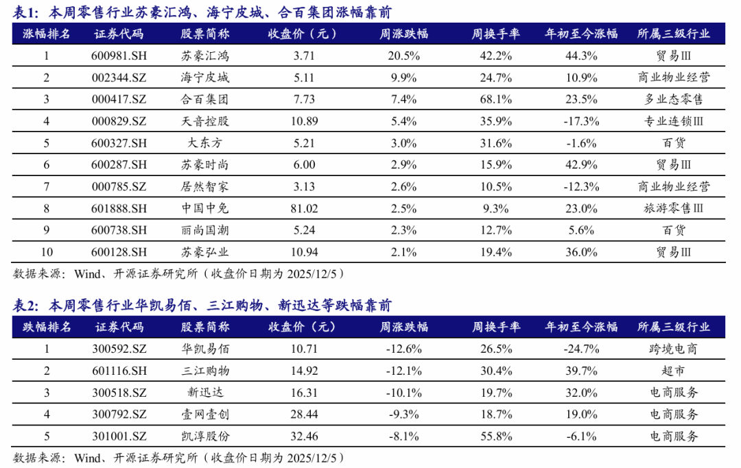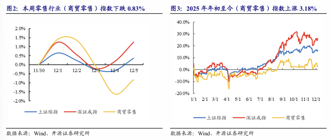本周(12月1日-12月5日)A股上涨,零售行业指数下跌0.83%。上证综指报收3902.81点,周累计上涨0.37%;深证成指报收13147.68点,周上涨1.26%;本周全部31个一级行业中,表现排名前三位的分别为有色金属、通信和国防军工。零售行业指数(参照商贸零售指数)本周报收2310.07点,周跌幅为0.83%,在所有一级行业中位列第22位。2025年年初至今,零售行业指数上涨3.18%,表现弱于大盘(2025年年初至今上证综指累计上涨16.44%)。