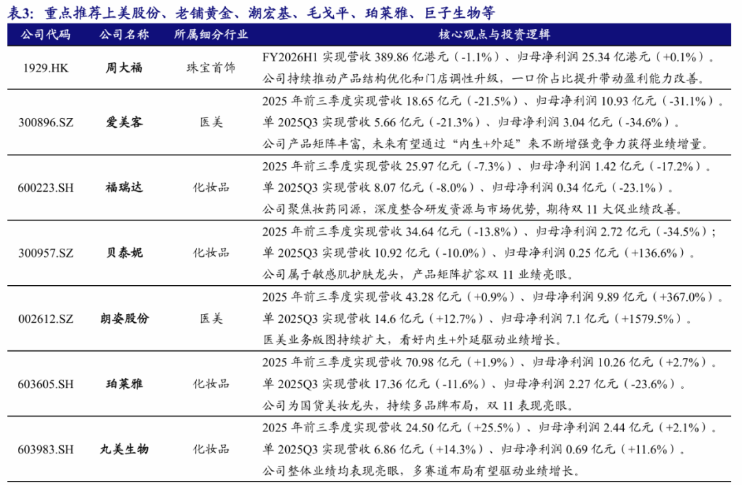 投资主线三(化妆品):关注满足情绪价值和安全成分创新的国货品牌,重点推荐毛戈平、珀莱雅、上美股份、巨子生物、丸美生物、润本股份等;
