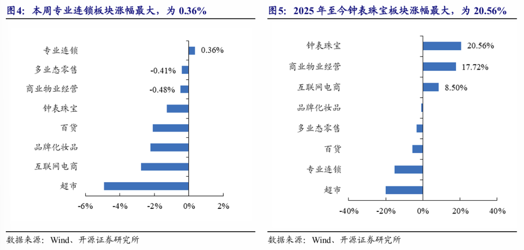 零售各细分板块中,专业连锁板块本周涨幅最大;2025年年初至今,钟表珠宝板块涨幅最大。在零售行业各主要细分板块(我们依据二级行业分类,选择较有代表性的超市、百货、多业态零售、专业连锁、商业物业经营、互联网电商、钟表珠宝和品牌化妆品8个细分板块)中,本周1个子板块上涨,其中专业连锁板块涨幅最大,周涨幅为0.36%;2025年全年来看,钟表珠宝板块年初至今累计涨幅为20.56%,在零售行业各细分板块中领跑。