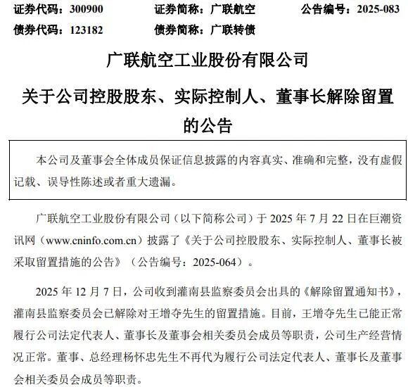 12月7日消息,广联航空(证券代码:300900)发布公告称,公司控股股东、实际控制人、董事长王增夺解除留置。