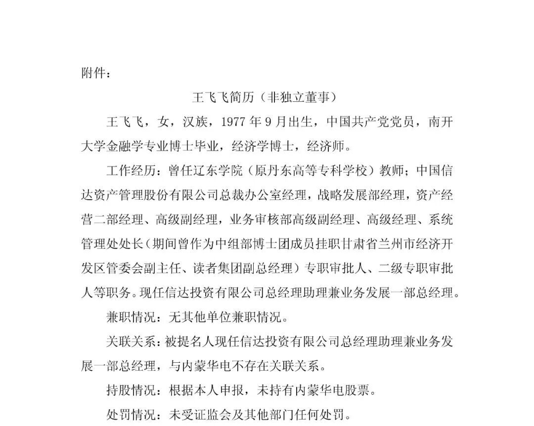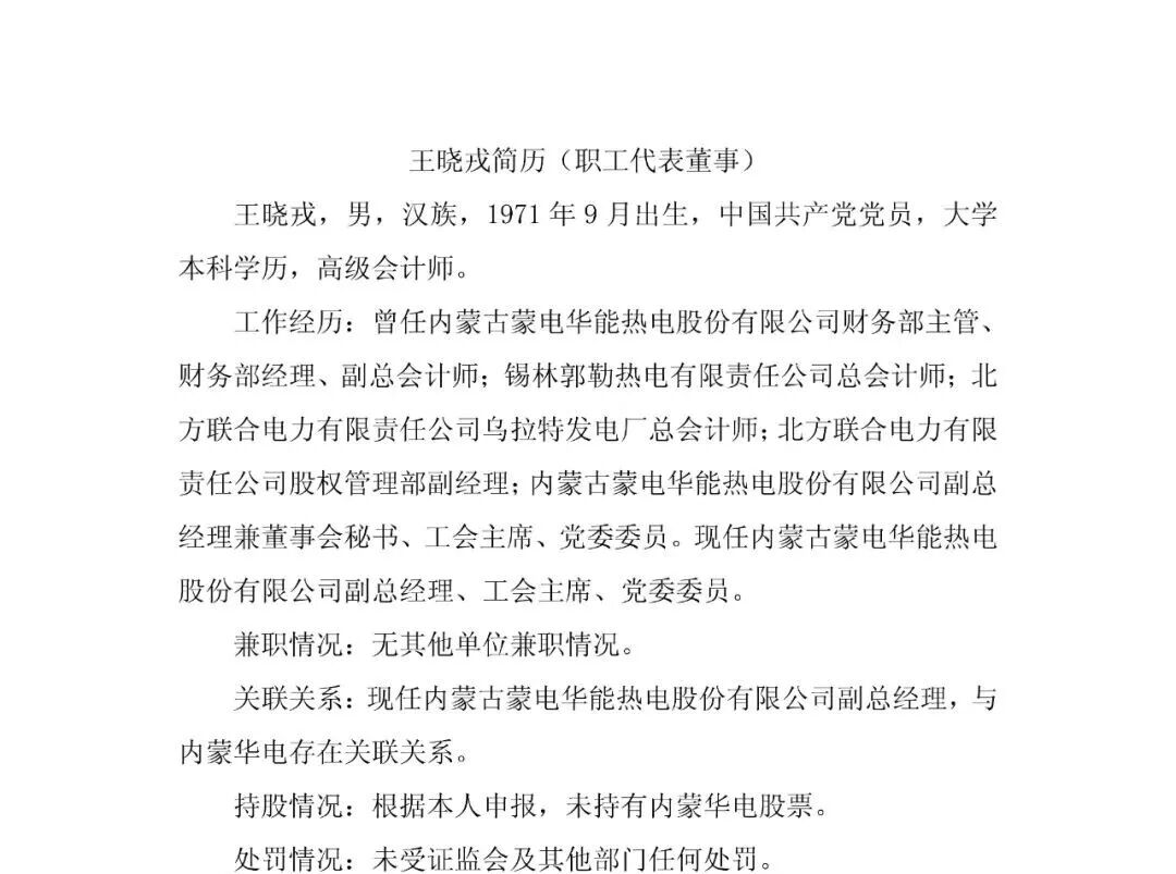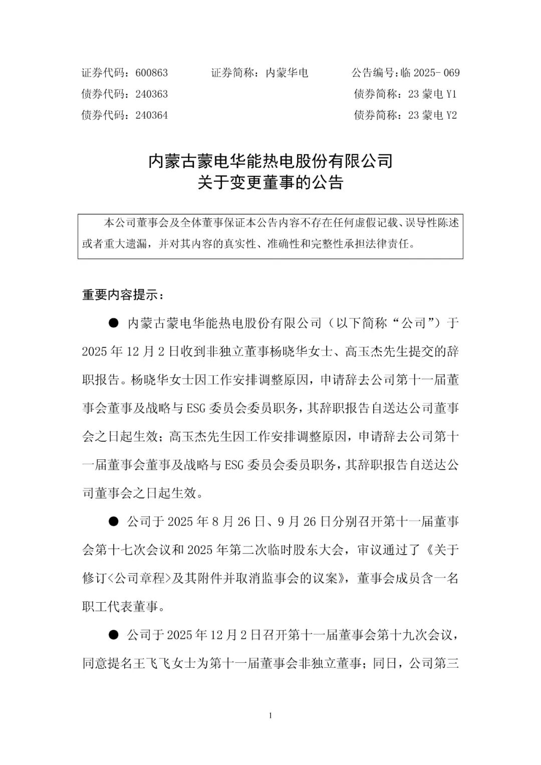 12月3日,内蒙华电发布公告称,内蒙古蒙电华能热电股份有限公司召开第十一届董事会,公司收到非独立董事杨晓华女士、高玉杰先生的辞职报告。杨晓华女士因工作安排调整,辞去公司第十一届董事会董事及战略与ESG委员会委员职务,辞职报告自送达公司董事会之日起生效;高玉杰先生因工作安排调整,辞去公司第十一届董事会董事及战略与ESG委员会委员职务,辞职报告自送达公司董事会之日起生效。