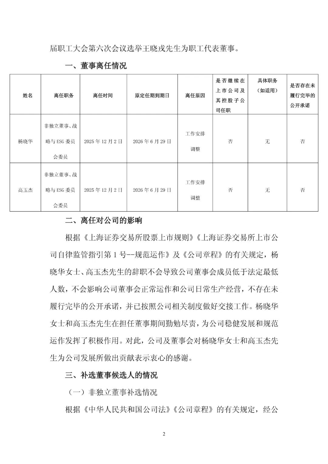 审议通过《关于变更公司第十一届董事会部分董事的议案》,同意提名王飞飞女士为公司第十一届董事会非独立董事,任期自股东会审议通过之日起至本届董事会届满之日止。公司于2025年12月2日召开第三届职工大会第六次会议,选举王晓戎先生为职工代表董事,任期自2025年12月2日起至本届董事会届满之日止。