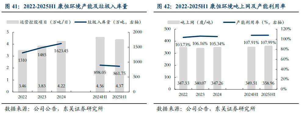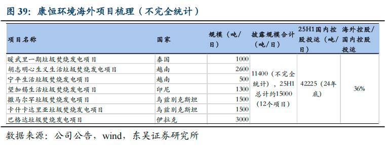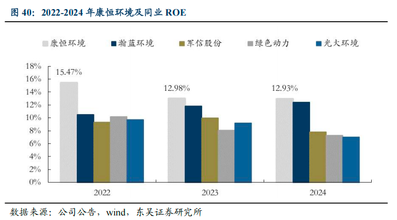 康恒环境垃圾焚烧设备与运营规模领先,积极开拓国际新版图。①设备:作为全球TOP1的垃圾焚烧设备与技术提供者,截至2025年6月底,服务300+座焚烧厂,应用总规模超30万吨/日,国内市占率超40%;②运营:作为全球TOP3的低碳静脉产业园投资者,全球参控股的12万吨/日,服务超1亿人口。据康恒环境债券募集说明书,其垃圾焚烧运营产能呈上升趋势,2024年底控股运营产能4.22万吨/日,垃圾入库量1623.45万吨,上网电量56.38亿度,提供蒸汽41.00万吨。公司运营效率优异,2024年产能利用率105.34%,吨上网发电量达347.26度,超过行业平均水平。康恒环境率先进行海外布局,2024年底已在海外设立 6个代表处,并在越南、泰国、印度尼西亚、马来西亚、乌兹别克斯坦等国家投资建设静脉产业园项目。中企海外投资总规模第一,海外再造一个康恒“十年三倍”:2025年康恒提出“十年三倍”的全新目标,希望通过垃圾焚烧出海实现“海外再造一个康恒”。截至2025年6月底,康恒环境已累计在海外中标垃圾焚烧发电项目12座,总规模约1.5万吨/日(在建/筹建居多,未来产能有望实现快速爬坡)。ROE行业领先:2022-2024年,公司ROE分别为15.47%/12.98%/12.93%,分别高出同业平均水平5.53%/3.22%/4.30%(同业选取瀚蓝、军信、绿动、光大4家)。