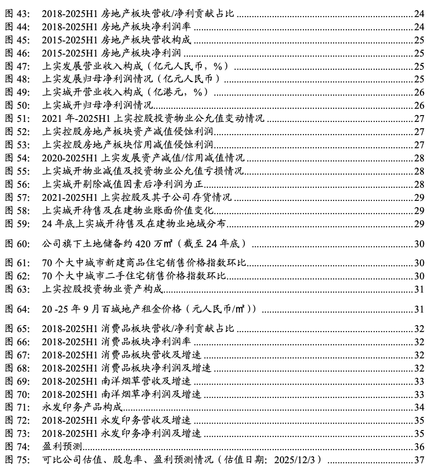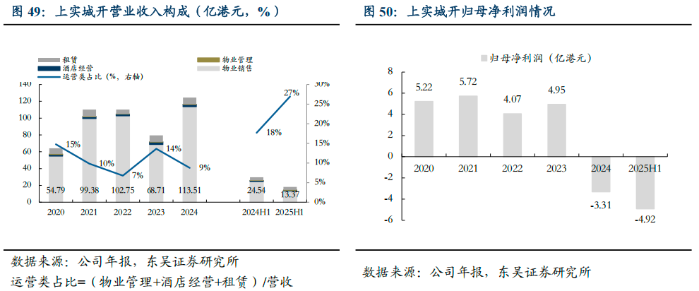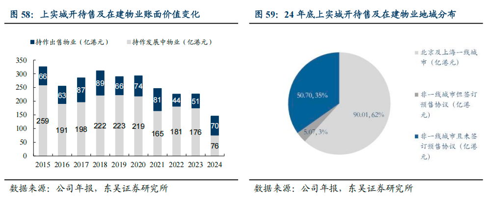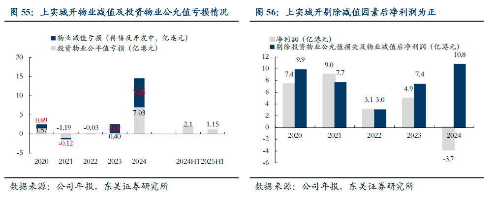 (2)上实城开:于2023年、2024年投资物业公允价值亏损0.40亿港元、7.03亿港元,其中24年主要系上海世贸商城等投资物业因新租约的租金下调,导致按投资法折现的物业公允价值降低;2023年、2024年待售及开发中物业计提减值损失2.09亿港元、7.45亿港元。将上述减值简单加回后,上实城开2024年净利润达10.75亿港元,同比增长45.40%。