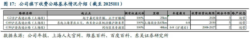 公司拥有三条高速公路,G50沪渝高速改扩建后期限有望延长。上实控股拥有上海市内三条收费公路,包括京沪高速公路(上海段)、沪昆高速公路(上海段)、沪渝高速公路(上海段),分别是上海市往西北、西南、正西方向链接其他核心城市的重要通道。公司沪渝、京沪、沪昆高速公路(上海段)的收费经营权到期年限分别为2027/2028/2030年,通过扩建等方式有望续期。根据2024年发改委审议通过的《基础设施和公用事业特许经营管理办法》,最长特许经营期从30年延长至40年,投资规模大、回报周期长的特许经营项目可以根据实际情况适当延长。2025年7月3日,G50沪渝高速拓宽改建工程项目申请报告获市发改委核准。工程东起嘉闵高架路,西至西岑支路,全长约32.6千米,由现状双向4-6车道拓宽为双向8车道。改扩建后公司的G50公路特许经营权期限有望延长,且车流量有望进一步提升。