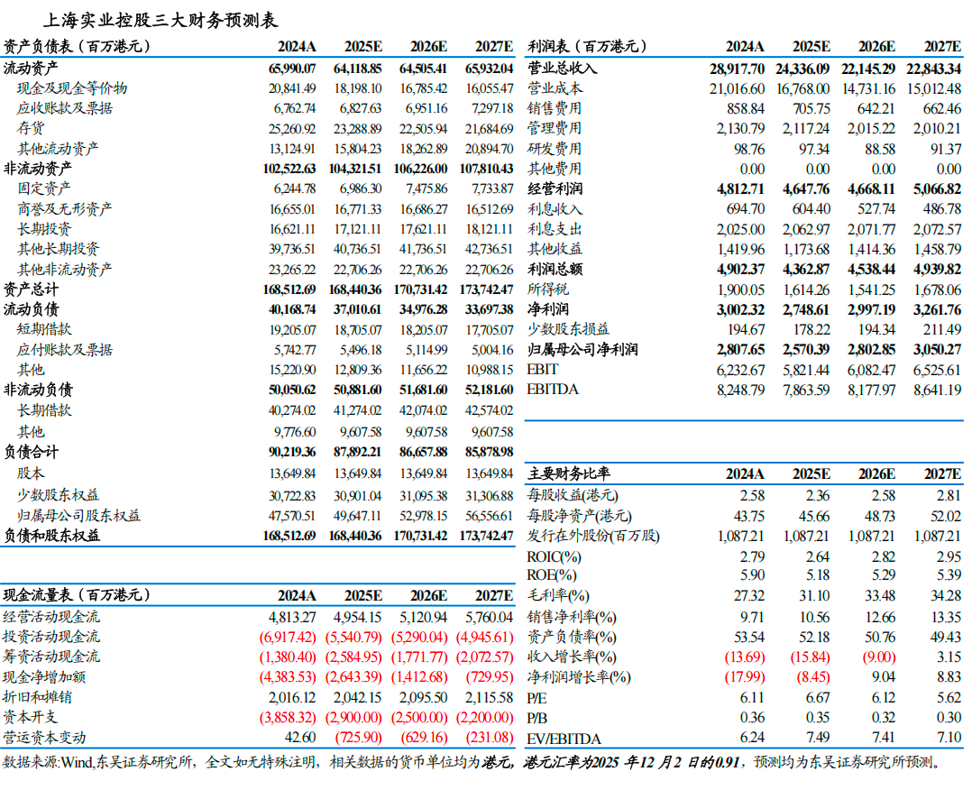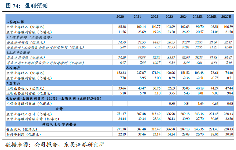 基建环保板块:24年基建环保溢利贡献较高主要系出售杭州湾大桥股权带来的8.63亿港元一次性投资收益,考虑到25年后出售粤丰环保相关股权的投资收益减少,我们预计25-27年高速公路贡献溢利10.96/11.22/11.40亿港元,同比增长1.38%/2.37%/1.65%;25-27年水务板块的主要公司(上实环境、中环水务、康恒环境)贡献溢利6.61/6.84/7.10亿港元,同比增长-21.90%/3.51%/3.71%;考虑到杭州湾大桥的Reits的分红及其他投资收益,我们预计25-27年基建环保板块贡献溢利20.57/21.06/21.50亿港元,同比变动-21.76%/2.39%/2.09%。
