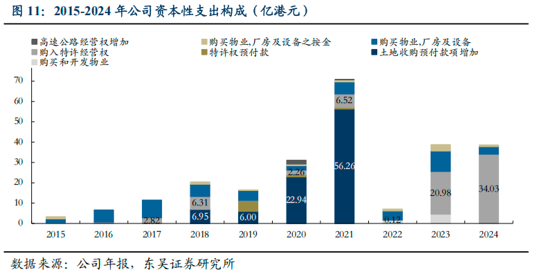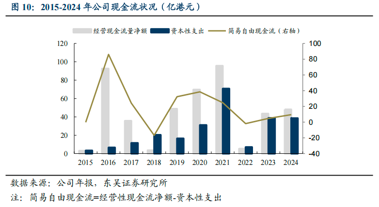 经营性现金流持续正流入,房地产收缩资本开支减少,自由现金流加速回正。经营性现金流持续正流入:2020-2024年经营性现金流净额分别为69.68/95.59/5.26/43.55/48.13亿港元,其中2022年下滑主要系当年受疫情影响业绩下滑且21年存在一次性递延收益41.49亿港元的现金流入(详见下文2.1收费公路/大桥政府补助事项说明);资本性支出整体呈下降趋势,从地产板块转向水务板块:2020-2024资本开支分别为31.13/70.82/7.12/38.77/38.58亿港元,其中21-22年土地收购预付款合计支出79.20亿港元,23-24年转向购入水务板块特许经营权合计支出55.02亿港元,高速和大消费板块资本开支相对较少。自由现金流加速回正:2022-2024年简易自由现金流分别为-1.85/4.78/9.55亿港元,持续增厚。