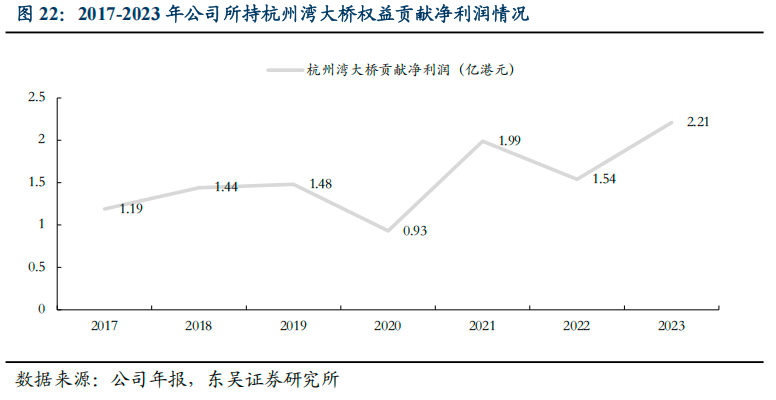 杭州湾大桥历年净利润回报颇丰,24年发行REITs后为公司带来现金流收益且变现能力增强。公司于2016年作价18.03亿港元收购杭州湾大桥(特许经营权25年,2033年到期)23.06%权益,2017-2023年该部分权益累计贡献净利润10.78亿港元,平均每年1.54亿港元,收益率达8.54%。2024年杭州湾大桥向公众发行REITs,公司以18.64亿港元对价出售其所有的股权,并以13.88亿港元认购1.58亿份REITs份额,占总份额15.83%。此举影响有二:(1)实现了净现金流入:通过“高卖低买”的份额差,公司在未完全退出该优质资产的情况下,成功将多年的投资增值部分变现,显著增强了集团的资金流动性;(2)收入性质发生转变,变现能力增强:公司对杭州湾大桥的回报从按照股权比例权益法入账利润转化为来自REITs的、具有强制高比例分红属性的稳定现金流。