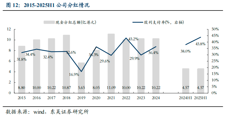 2021-2024年分红总额每年超10亿港元,高分红有望持续。2021-2024年公司派息总额整体维持在较高水平,每年均超过10亿港币,2024年分红总额10.22亿港元,同比持平;25H1分红总额4.57亿港元,同比持平。分红比例随业绩变化小幅波动,2021-2024年维持在29.61%至43.23%之间。在手现金充裕:截至2025年6月底,公司账面现金及等价物(含定期存款)合计273.22亿港元,主要系2025年5月粤丰私有化将带来近40亿港元现金净流入(出售粤丰现金回笼现金23.29亿港元、粤丰大股东还款近17亿港元,详见下文2.2.4)。在资本开支下降、在手现金充裕背景下,分红比率仍有上调空间,高分红有望持续。