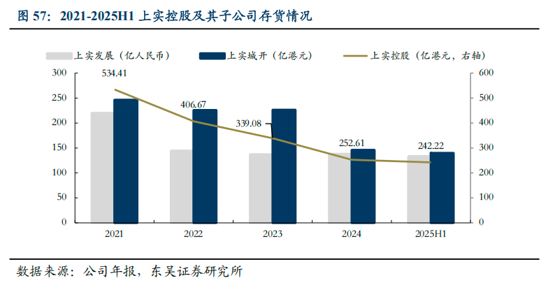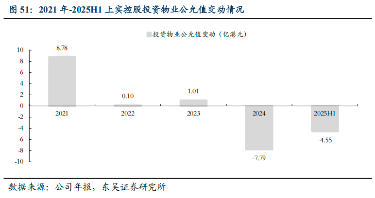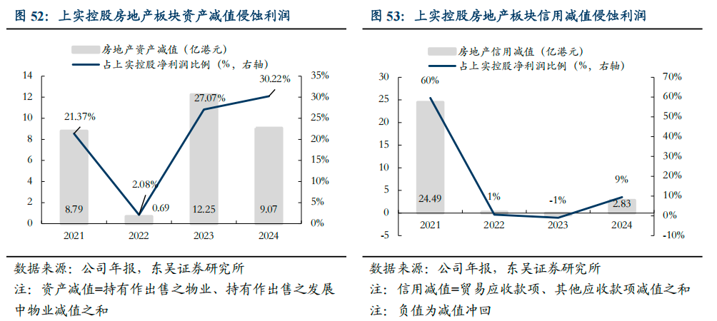 房地产业务对上实控股拖累主要源于减值:受租金及物业交易价格下跌影响,2024年/2025H1上实控股投资物业公允值变动分别为-7.79/-4.55亿港元。2021-2024年地产板块资产减值(主要系用作出售之物业)达8.79/0.69/12.25/9.07亿港元,占当年上实控股净利润比例21.37%/2.08%/27.07%/30.22%;2021-2024年地产板块信用减值达24.49/0.22/-0.42/2.83亿港元,占当年上实控股净利润比例59.55%/0.65%/-0.94%/9.42%。