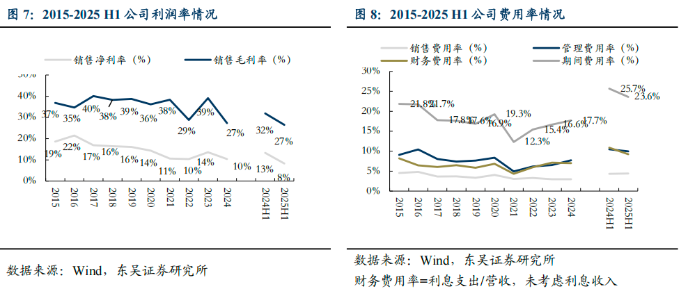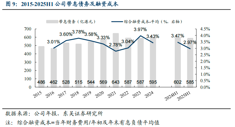 有息负债增速趋稳,叠加利率下行,财务费用有望保持下行趋势。2024年公司毛利率、净利率分别为27.32%/10.38%,同比下滑11.79pct/3.26pct,主要受房地产业务波动影响。2024年公司管理费用(港股列示为行政、管理费用及其他营业费用科目)、财务费用、销售费用分别为22.30/20.25/8.59亿港元,较2023年同比变动-12.19%/4.55%/-13.18%;公司管理费用率、财务费用率、销售费用率分别为7.71%/7.00%/2.97%,同比变动1.19/-0.13/-0.02pct,2025H1毛利率、净利率下滑至26.51%、8.32%,但期间费用率较24年同期降低2.06pct至23.61%,其中财务费用率下降1.64pct至9.23%。从负债端来看,公司有息债务自2022年以来进入平稳期,2024年末有息债务达594.79亿港元,2025年6月底较年初下降2.76%至585.03亿港元。随着水务新增项目减少、房地产投资节奏放缓,叠加公司账面现金充裕,负债规模有望得以控制;2024年公司的综合融资成本3.43%,同比减少0.55pct,25H1同比减少0.50pct至2.97%。随着利率进入下行阶段,公司融资成本有望进一步降低,公司财务费用仍有节省空间。