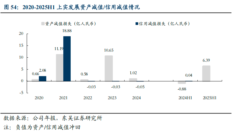 (1)上实发展:2020-2025H1资产减值分别为0.66/11.19/0.58/10.65/1.02/6.39亿元人民币、信用减值损失达2.08/18.88/-0.03/-0.03/-0.05/0亿元人民币,其中21年大额计提主要系子公司上实龙创应收账款出现不可收回风险,其他业务无类似内控风险,25H1的资产减值主要系存货成本高于可变现净值,期待地产价格企稳;