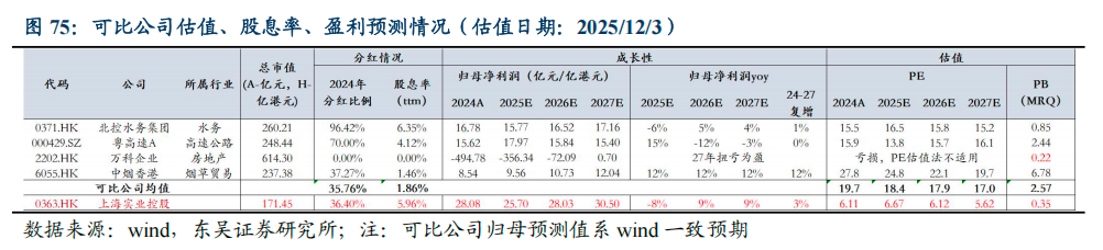 根据上实控股各版块业务属性,我们选取水务、高速、房地产、烟草行业上市公司北控水务集团、粤高速A、万科(H股)、中烟香港作为可比公司,可比公司对应2025年PE均值为18.4倍,PB(MRQ)均值为2.57倍,公司对应2025年PE为6.67倍,PB(MRQ)为0.35,低于可比公司估值。从股息率视角来看,公司股息率(ttm)达5.96%,在同业中处于较高水平,且公司24年分红比例仅为36.40%(北控水务同期为96.42%),分红仍具提升潜力(估值日期:2025/12/3)。