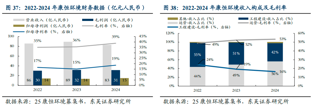 运营类收入占比提升,盈利能力改善。康恒环境2022-2024年营业收入分别为85.81/89.36/83.00亿元人民币,归母净利润分别为14.24/13.51/15.05亿元人民币。2024年毛利率及归母净利率分别为38.85%、18.65%,同比增长3.32pct、3.53pct。2022-2024年,运营类项目收入占比持续上升,且运营毛利率不断提升,2024年运营类项目收入占比达56.20%,同比增加7.29pct,运营毛利率为53.31%,同比增加1.03pct;2024年建设收入占比41.73%,同比减少8.81pct,建设毛利率下滑至16.49%。