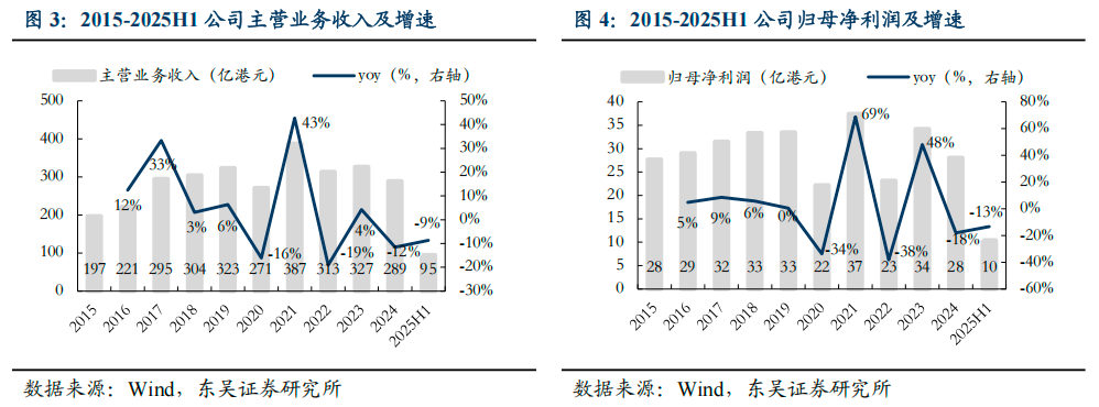 2024年及2025H1公司受房地产业务影响业绩承压。2020-2024年公司营业收入先升后降,2024年实现主营业务收入289.18亿港元,同比下降11.56%,主要系房地产业务销售结转金额较23年同期下降。2024年归母净利录得28.08亿港元,同比下降17.99%,主要系房地产板块录得亏损-2.36亿港元,而2023年同期该板块贡献了8.39亿港元。25H1营收94.77亿港元,同比减少8.60%,25H1归母净利10.42亿港元,同比减少13.24%,主要系房地产板块承压。