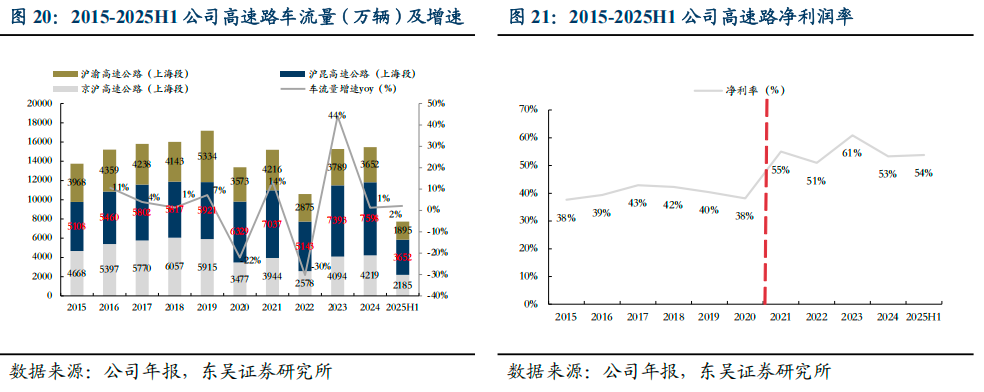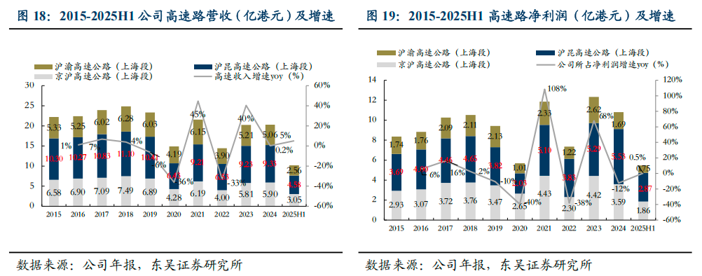 各高速公路为公司提供稳定收益和经营性现金流,2021-2024年净利率明显提升。2024年高速公路通行费收入、净利润、车流量分别为20.29亿港元、10.81亿港元、15469万架次,较2023同期变化0.20%、-12.33%、1.26%。自2023年疫情平稳后,公司高速公路业务表现稳健。整体来看,2020/2022年业绩波动主要系疫情期间车流量减少及特许经营权减值所致。2025H1公司高速收入同比增长5.16%,车流量同比减少10.05%至7732万架次。递延收益:据上实控股2021年6月22日自愿披露公告,上实控股旗下若干高速路入城段自2020年5月6日起免收通行费。作为补偿,2021年6月22日上海市交通委员会同意支付税前总额42.72亿港元(记为递延收益,按车流量法摊销)的政府补助,上实控股旗下的高速公路公司继续承担养护经营责任。自此,2021-2025H1年高速公路净利率较2015-2019年明显提升。2021-2024年所确认的政府补助金额分别为4.09/2.09/4.06/4.38亿港元,截至2024年剩余22.24亿港元未摊销,其中4.67亿港元将于一年内摊销确认为利润。