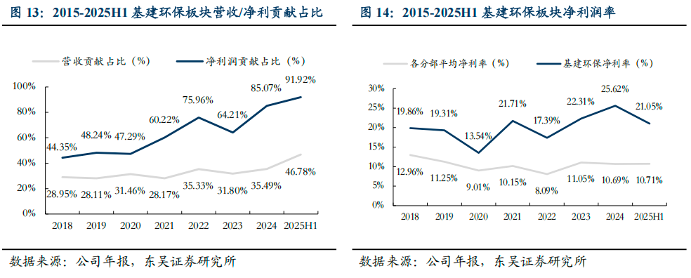 优质核心资产成为公司业绩压舱石,24年基建环保业务利润贡献提至85.07%。2018-2024年公司基建环保板块营收贡献占比自28.95%增长至35.49%,提升6.54pct,净利润贡献占比自44.35%增长至85.07%,提升40.72pct;2025H1基建环保板块营收及净利润贡献占比分别为46.78%、91.92%。基建环保属于公用事业领域,高速公路及核心水务项目在一定区域内具有垄断性质,业务需求稳定,逆周期调节属性强,在房地产业务下行压力较大的背景下,为公司带来了稳健的收入、利润及现金流。基建环保板块净利率高于公司整体净利率。2018-2024年公司基建环保板块净利率从19.86%波动增长至25.62%,2025H1净利率为21.05%,高于各分部业务的平均净利率,24年净利率上升主要系高速业务恢复、出售杭州湾大桥利得、水务公司收入结构改善等。