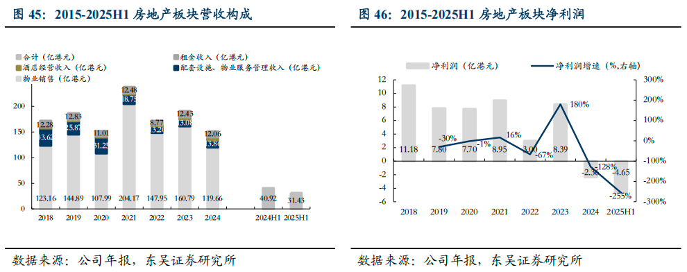 (2)房地产板块:2024年贡献净利润-2.36亿港元,占比-7.64%(拖累项)。2025H1贡献净利润-4.65亿港元。受房地产行业下行压力影响,该板块正处于存货去化、战略收缩阶段。