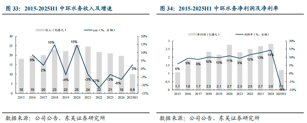 收入下滑但净利润增长。2015-2024年,中环水务营收先升后降,2020-2024年公司营收自25.17港元降至19.42港元,降幅达22.85%。2015-2024年,中环水务净利润及净利率整体呈上升趋势,2024年净利润及净利率分别为2.79亿港元、14.37%,同比变化5.28%、1.60pct。2025H1中环水务收入及净利润分别为9.80亿港元、1.20亿港元。同比变动2.5%、-8.0%。