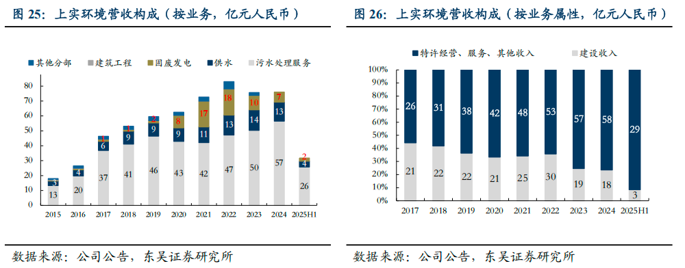 上实环境营业结构优化。2015-2024年,上实环境营业收入从18.04亿元人民币增长至75.96亿元人民币,年复合增长率为17.36%;在此期间,上实环境通过高质量的增长战略实现了业务规模的扩大。2025H1上实环境营收31.77亿元人民币,同比减少4.39%。分业务来看,污水处理服务贡献了主要的营收增长,从2015年的13.29亿元人民币增长至2024年的56.52亿元人民币,年复合增长率17.45%;2023年固废发电业务营收为9.76亿元人民币,较2022年回落44.34%,主要系上海宝山新能源利用主要部分工程于2022年完工(于2023年试运营),2023年固废的建设收入仅5.04亿元人民币,同比2022年减少65.83%。分收入属性来看,2022-2024年建设收入从29.69亿元人民币下降至17.96亿元人民币,整体占比从35.76%下降至23.64%。2025H1上实环境建设收入2.72亿元人民币,同比下降51.69%,占比较上年同期下降8.37pct至8.55%。随着宝山等新增项目及提标改造项目陆续项目转投运,未来建设收入占比将维持低位,同时新增项目带来产能爬坡将带动运营收入进一步增长,公司营收结构改善,业绩稳健性提升。