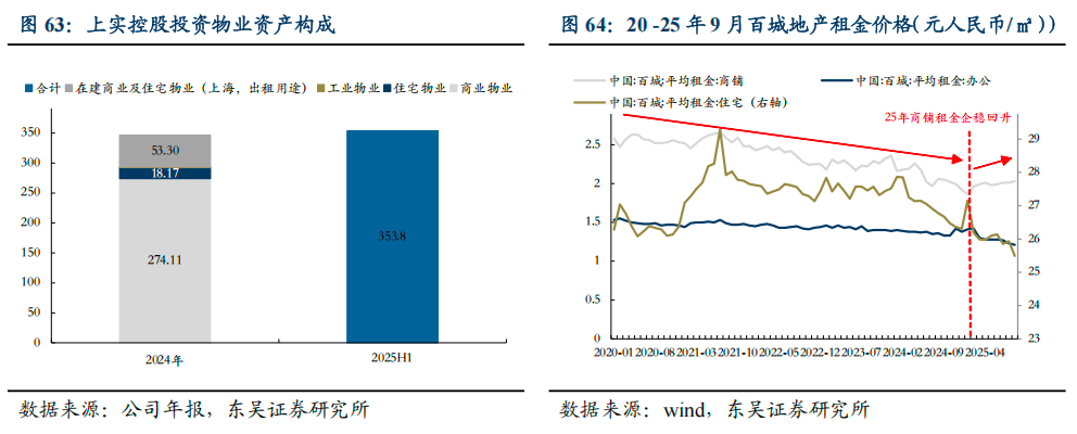 投资物业:2024年/2025年6月底上实控股持有投资物业(以出租和增值为目的)分别为346.82/353.80亿港元,其中主要以商业物业为主,另有少量住宅物业。该部分资产以公允价值计量,其价格受同类资产的租金收益率以及交易价格影响。25年商品租金价格企稳回升,9月平均租金较1月回升9.14%;住宅及办公用途地产租金延续下行,关注地产租金价格企稳。