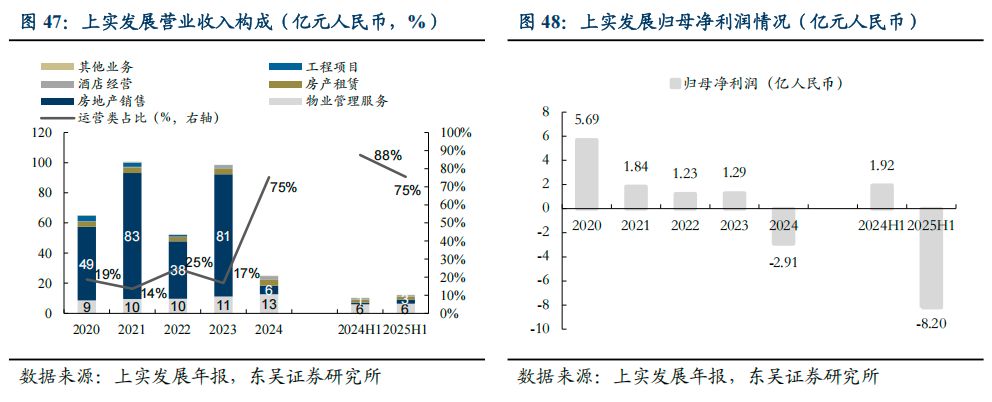 24年房地产销售下滑业绩承压,运营类收入占比升至75%。2020-2024年,上实发展业绩受房地产销售影响呈现较大波动,其中2020年及2022年收入下滑主要系疫情冲击及交房节奏具有周期性。2024年,上实发展实现营业收入约24.94亿元人民币,同比下降74.7%,归母净利亏损2.91亿元人民币,同比下降325.58%,主要系年内交房结转收入大幅减少。2025H1上实发展营业收入12.32亿元人民币,同比增长20.07%,归母净利润亏损8.20亿元人民币,主要系存货跌价计提减值6.39亿元人民币影响。从营收构成来看,运营类收入(酒店经营、房产租赁、物业管理)增长稳健,对整体收入支撑作用凸显。2020-2024年,运营类收入从12.24亿元人民币增长至18.77亿元人民币,年复合增长率11.28%,2025H1公司运营类收入为9.30亿元人民币,营收占比达74.49%。