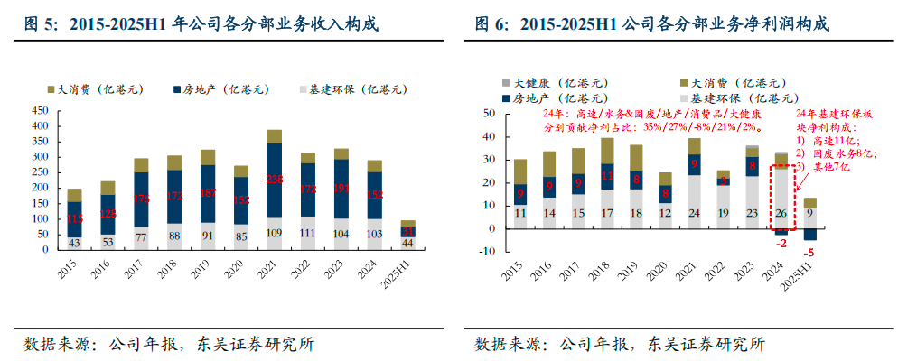 (1)基建环保板块: 2024年贡献净利润26.29亿港元,占比85.07%(按“主营业务溢利贡献”口径计算占比,下同)。包括:1)高速公路:24年贡献净利10.81亿港元,占比34.98%。2)固废&水务:24年贡献净利8.46亿港元,占比27.39%(注:固废&水务板块净利仅测算上实环境、中环水务、康恒环境、粤丰环保)。该板块表现稳健,2021年-2024年营收维持在100亿港元以上,贡献净利润20亿以上(2022年受疫情影响下滑至19.26亿港元)。2025H1该板块贡献净利润9.33亿港元,占比达89.54%。3)其他:主要包括投资收益、资产处置非经常性损益,24年贡献净利7.02亿港元(其中出售杭州湾大桥股权收益(扣税后)8.63亿港元),占比22.70%。