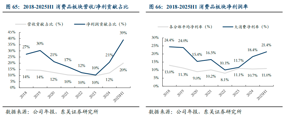 大消费板块24年贡献净利润20.81%,净利率高于整体7.67pct。公司消费品板块主要涉及烟草及印刷业务,2018-2024年,受疫情影响,消费板块营收贡献占比一度跌至2023年的9.80%, 2024年恢复至12.11%, 同比上升2.31pct。净利润贡献占比于2019年达高位30.32%,疫情期间逐步降至10.37%,2024年回升至20.81%,较2023年提升10.44pct。在疫情冲击后展现较强韧性与回弹能力。消费板块近年来净利率显著高于各分部的平均净利率,2024年大消费板块净利率18.36%,高出各分部平均净利率7.67pct。2025H1大消费板块加速回暖,营收及净利润贡献占比提升,净利润率亦有所改善。
