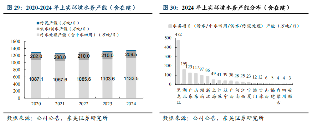 2020-2024年污水处理和供水产能稳中有升。2020-2024年,上实环境污水处理产能从1087.08万吨/日增长至1133.46万吨/日,CAGR=1.05%,污水处理产能缓慢增长;供水、污泥处理产能整体稳定,2024年分别为209.5万吨/日、0.24万吨/日。从产能分布来看,上实环境水务产能分布在全国各地,其中产能前三的地区分别为黑龙江、湖北、广东,2024年分别拥有472.07/159.00/123.00万吨/日,分别占比为35.15%/11.84%/9.16%。截至2024H1,公司污水处理总产能1116.96万吨/日,其中待建、在建/待投运产能分别为90.58万吨/日、41.92万吨/日,占总产能的8.13%、3.75%。
