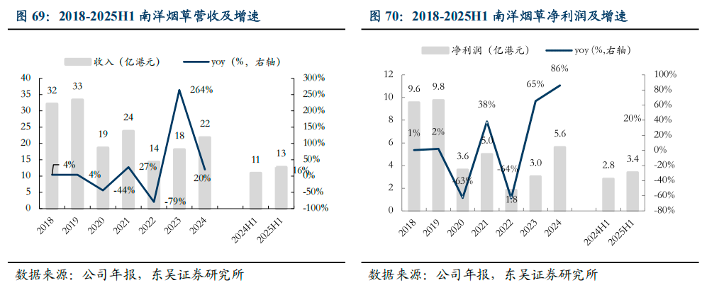 疫情后南洋烟草业务收入及利润在波动中逐步修复。(1)2015-2019年,收入维持在30.92-33.36亿港元之间,净利润从9.30亿港元增长至9.75亿港元。(2)2020-2022年,疫情冲击导致免税及出口市场需求承压,收入及利润均显著下滑。疫情期间由于高度依赖内地消费群体及供应链,公司在消费、物流和生产等环节受挑战,海外市场需求持续低迷,渠道库存高企,带来产品过期及价格下跌风险。(3)2023年至今:疫情后行业逐渐回暖,公司通过拓展海外市场、强化产品创新研发推动复苏,2024年营收及净利润分别回升至21.82亿港元、5.60亿港元,同比增长20.22%、86.05%。25H1营收及净利润分别为12.73/3.37亿港元,同比增长16.47%、19.93%。