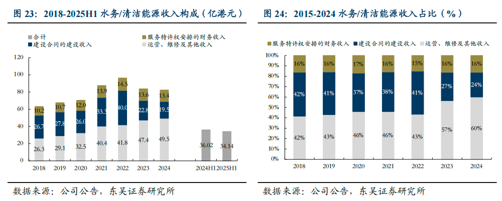 水务/清洁能源板块营收企稳,建设收入占比下降,盈利结构改善。2018-2024年,公司水务/清洁能源板块营收先增后降,2024年合计营收为82.34亿港元,同比减少1.67%,主要系建设合同收入较2023年减少3.30亿港元;2025H1营收34.14亿港元,同比减少5.22%,主要系水务工程建设类收入减少。从营收结构来看,建设收入占比近年来呈下降趋势,2024年占水务/清洁能源板块收入的23.64%,较2022年高点41.50%减少17.86pct;运营类收入占比连续上升,2024年占总收入的60.09%,较2022年低点41.50%增加16.67pct。截至2024年,该板块主要的并表公司为上海实业环境(持股49.29%),同时还持有中环水务45.00%、康恒环境14.17%、粤丰环保19.48%(于2025年6月剥离)。
