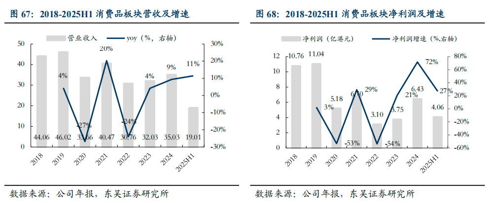 消费板块疫情期间营收与净利润波动,24年加速恢复。2020、2022年受疫情冲击,公司消费板块业绩承压,营业额降至33.66/30.76亿港元,同比下跌26.86%/23.99%,净利润降至5.18/3.10亿港元,同比下跌53.03%/53.67%。疫情后市场开放,库存压力减轻,公司业务逐渐回暖。2022到2024年公司消费板块营收由30.76亿港元增长至35.03亿港元,增长13.88%,净利润由3.10亿港元增至6.43亿港元,增幅107.42%,但仍未完全回暖至疫情前高位。2025H1大消费板块营收及净利润持续回暖。