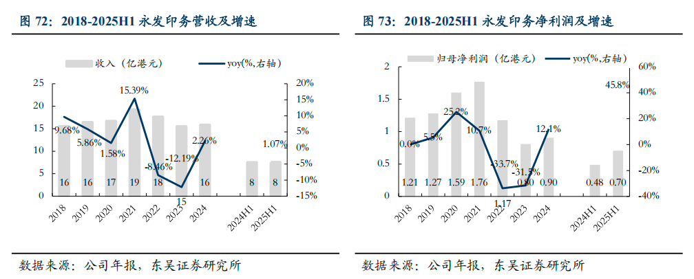 永发印务营收稳步增长、盈利能力持续提升。2014年以来,永发印务通过投资模塑纤维技术扩大了业务范围,并积极推动智能医药包装。2015-2021年营收从15.53亿港元增长至19.27亿港元,疫情期间下滑至2023年的15.49亿港元。2024年实现营收15.84亿港元,同比增长2.3%,主要受益于烟包业务的稳健增长,全年净利润8974.52万港元,同比提升12.10%,得益于业务结构优化推动综合毛利率上升、核心工厂降本增效成效显著,以及资产运营效率的提升。2025H1永发印务营收及净利润分别为7.59/0.70亿港元、同比增长1.07%、45.8%。