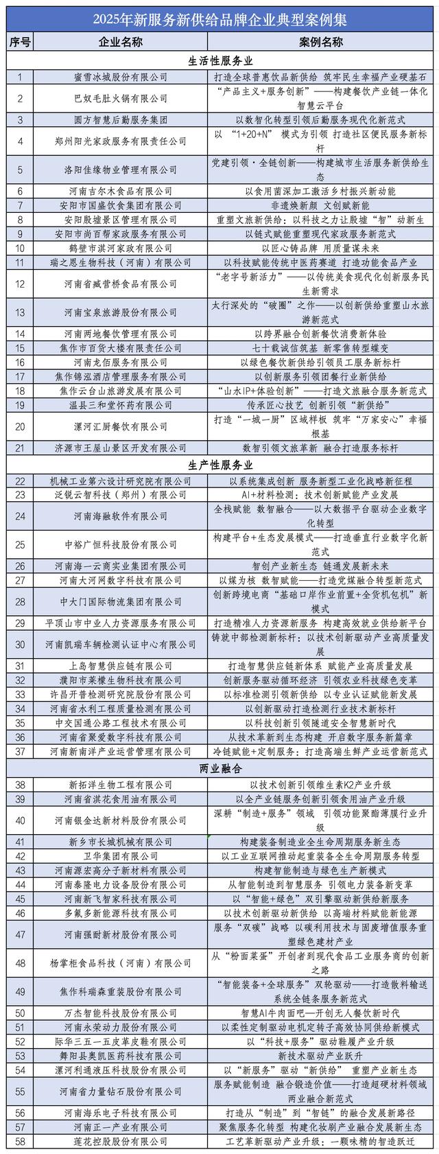 此次上榜的58个企业典型案例,包括泛锐云智、开普检测等以数智化重塑服务流程的生产性服务典范16家,蜜雪冰城、圆方物业等以新模式、新场景提升消费品质的生活性服务标杆21家,以及力量钻石、卫华集团等通过服务型制造实现价值链跃升的两业融合先锋21家,全面展示了我省服务业扩能提质的生动实践,为各地服务业新供给培育工作增活力、添动力提供了鲜活样本。