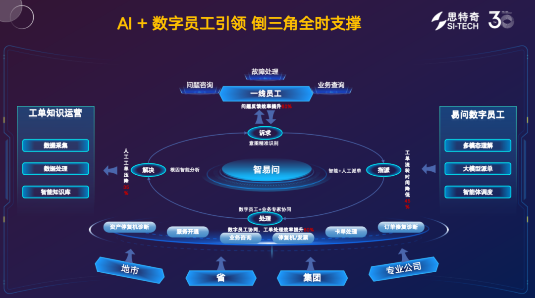 思特奇智易问基于“倒三角”支撑模式,以数字员工为核心重塑企业协同范式。通过多模态交互与精准意图识别,快速理解员工问题并智能关联知识或路由至专家数字员工;打通后端系统与知识库,实现常见问题自动答疑、流程类任务工单自动创建与闭环跟踪;在问题解决中自动沉淀知识、优化方案,形成“问-答-学”自生长闭环。