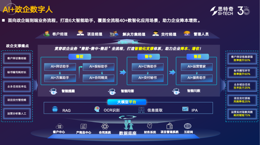 传统政企业务流程冗长、协同复杂,风控依赖人工,存在效率低、周期长、风险响应滞后等痛点。思特奇AI政企数字员工贯穿政企业务“售前-售中-售后”全流程与风控全链条,兼具智能助手与安全卫士双重角色。