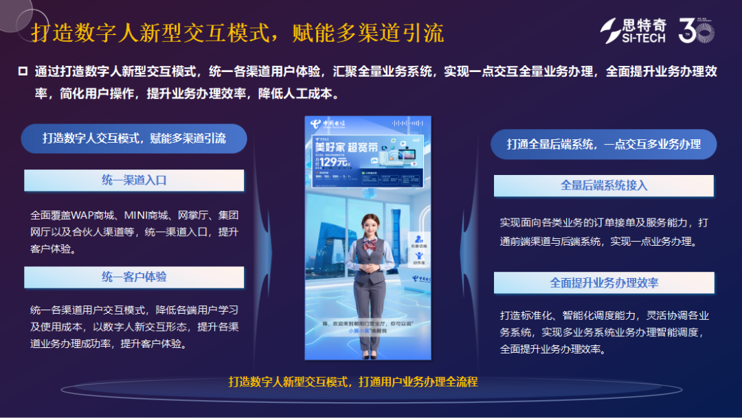 思特奇营业数字员工以高度拟人化形象与智能对话体验,打造新一代业务办理入口。依托多模态交互与情感化设计,提供7×24小时沉浸式智能咨询与办理服务;深度对接后端系统与知识库,支持开户、变更、查询等全业务无缝办理;灵活部署于APP、小程序等多渠道,保障统一标准的高品质体验。